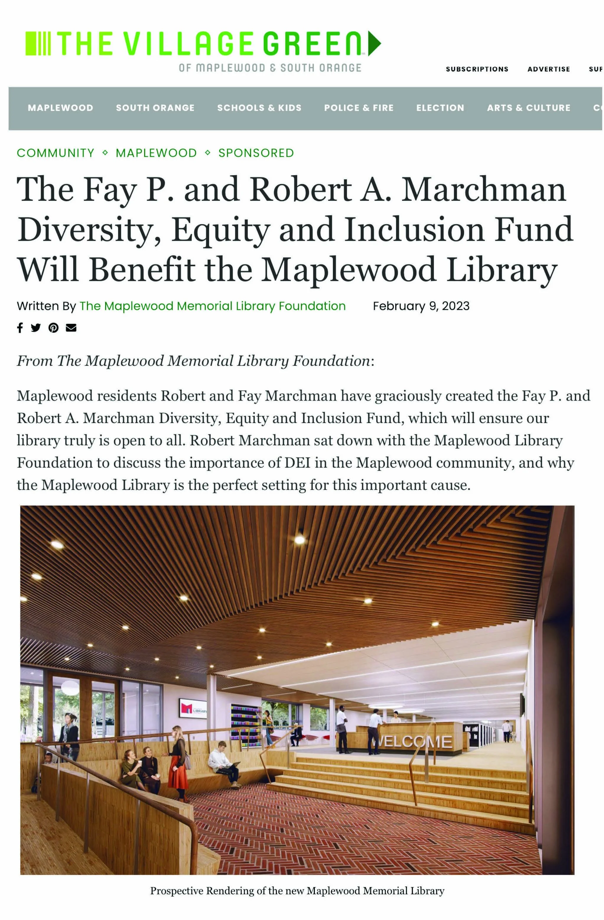 “In 1956, as a 12-year-old boy I witnessed with pride the dedication of the Maplewood Memorial Library building on Baker Street. Now, over 60 years later, I consider it a great privilege to be able to play a small role in renewing and enlarging that building. Our new Library will be a shining beacon of light, learning and inspiration, welcoming the people of Maplewood now and for future generations to come.”